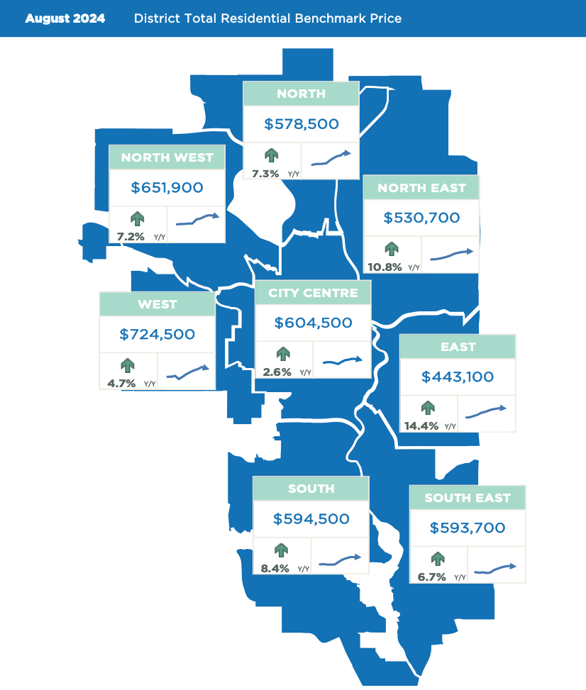 The unadjusted benchmark price in August was $461,700, slightly lower than last month but over 12 per cent higher than last August. Monthly adjustments were not consistent across districts, with adjustments in the City Centre, North West, North, and West districts mostly driving monthly declines. Despite the monthly adjustments, year-over-year prices remain higher than last year across all districts and range from a low of 10 per cent in the City Centre to a high of 26 per cent in the East district.