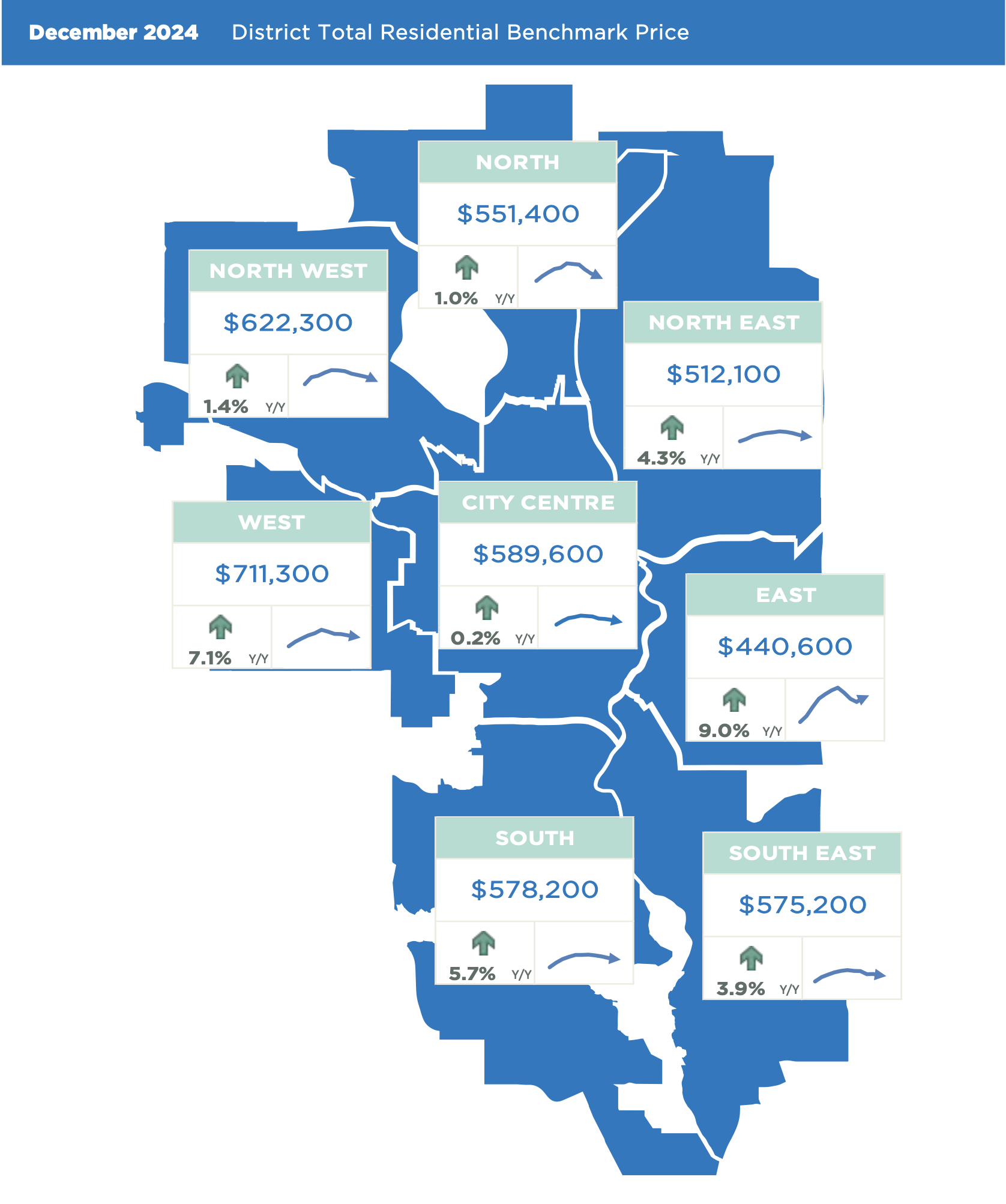 The relatively tight market conditions throughout the year caused prices to rise by nearly eleven per cent in 2024, a faster pace than what was reported in 2023. Much of that growth occurred during spring when supply levels were exceptionally low. Prices grew across all districts, with the strongest growth occurring in the most affordable districts of the North East and East.