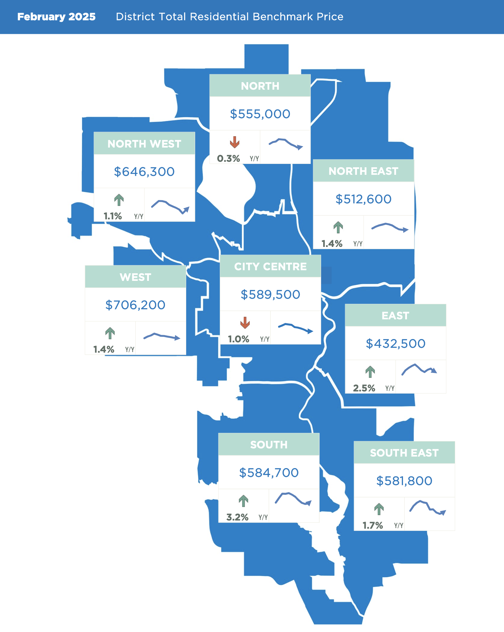 The total residential unadjusted benchmark price in February was $587,600, relatively stable compared to late-2024 and roughly one per cent higher year-over-year. Price changes varied across the city, with the City Centre and North districts seeing declines, while the East district saw the largest price growth at over three per cent.