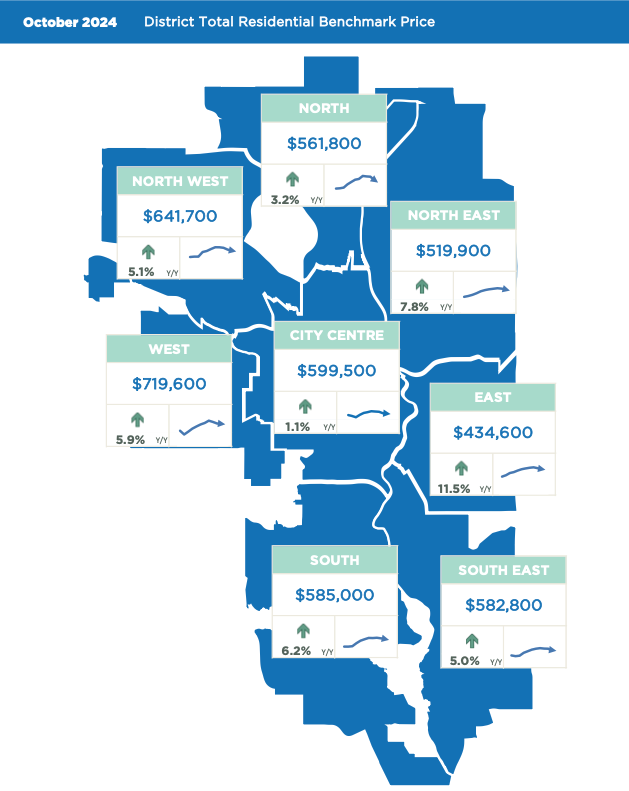 Overall, the total residential benchmark price was $592,500 in October, over four per cent higher than last October and on a year-to-date basis, averaging over eight per cent higher than last year's levels. The unadjusted benchmark prices did ease slightly over last month due to seasonal factors, as seasonally adjusted prices remained relatively stable in October compared to September.
