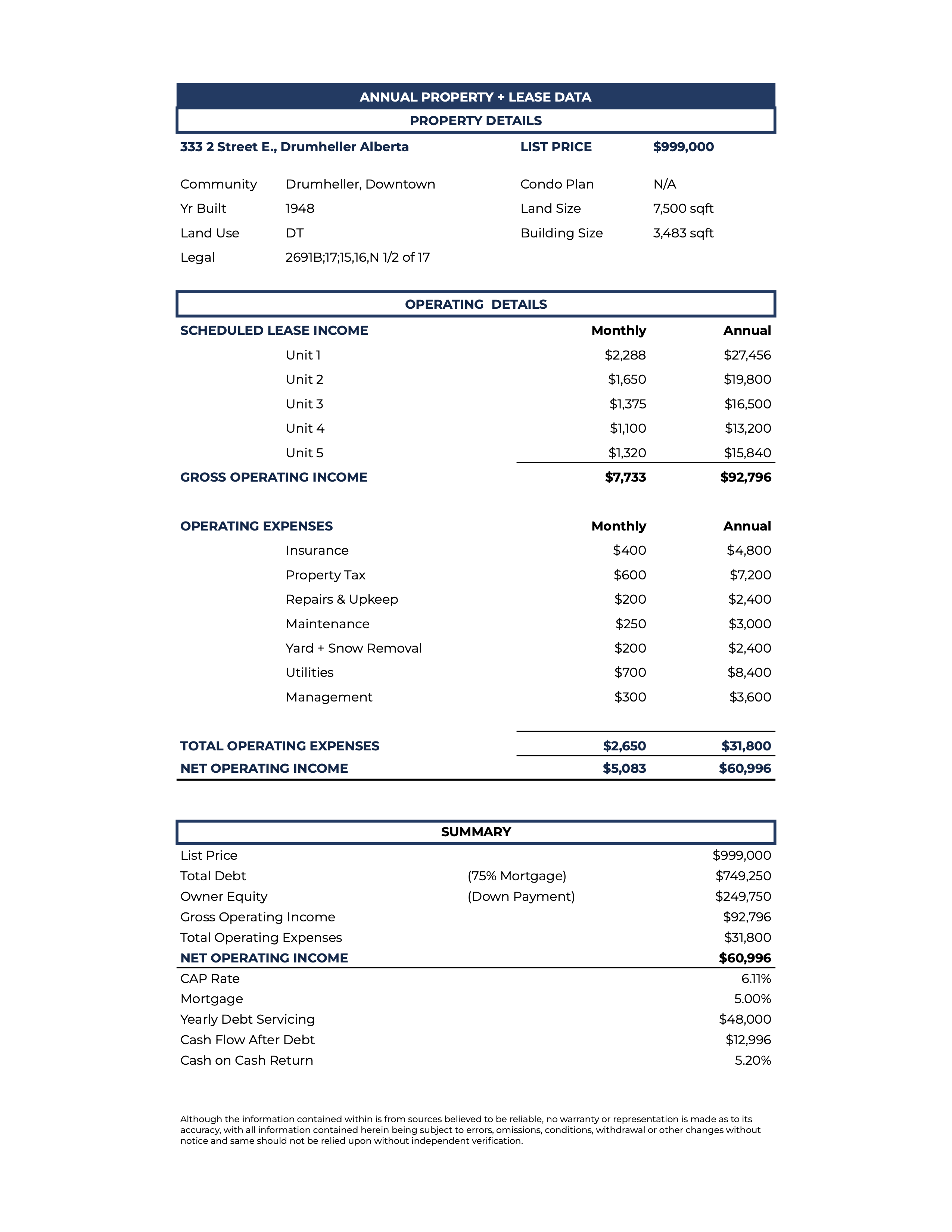 This charming multi-family building is situated in the heart of Drumheller's historic downtown revitalization district and has been beautifully maintained and renovated. It boasts a spacious 3,483 sqft layout and contains five self-contained rental suites ranging from one to three bedrooms, some with ensuites. The property has undergone extensive renovations, including upgrades to the electrical, windows, appliances, air conditioning units (4), furnaces, and a new roof. Additionally, each unit offers off-street parking, in-suite laundry, and separate secure storage.