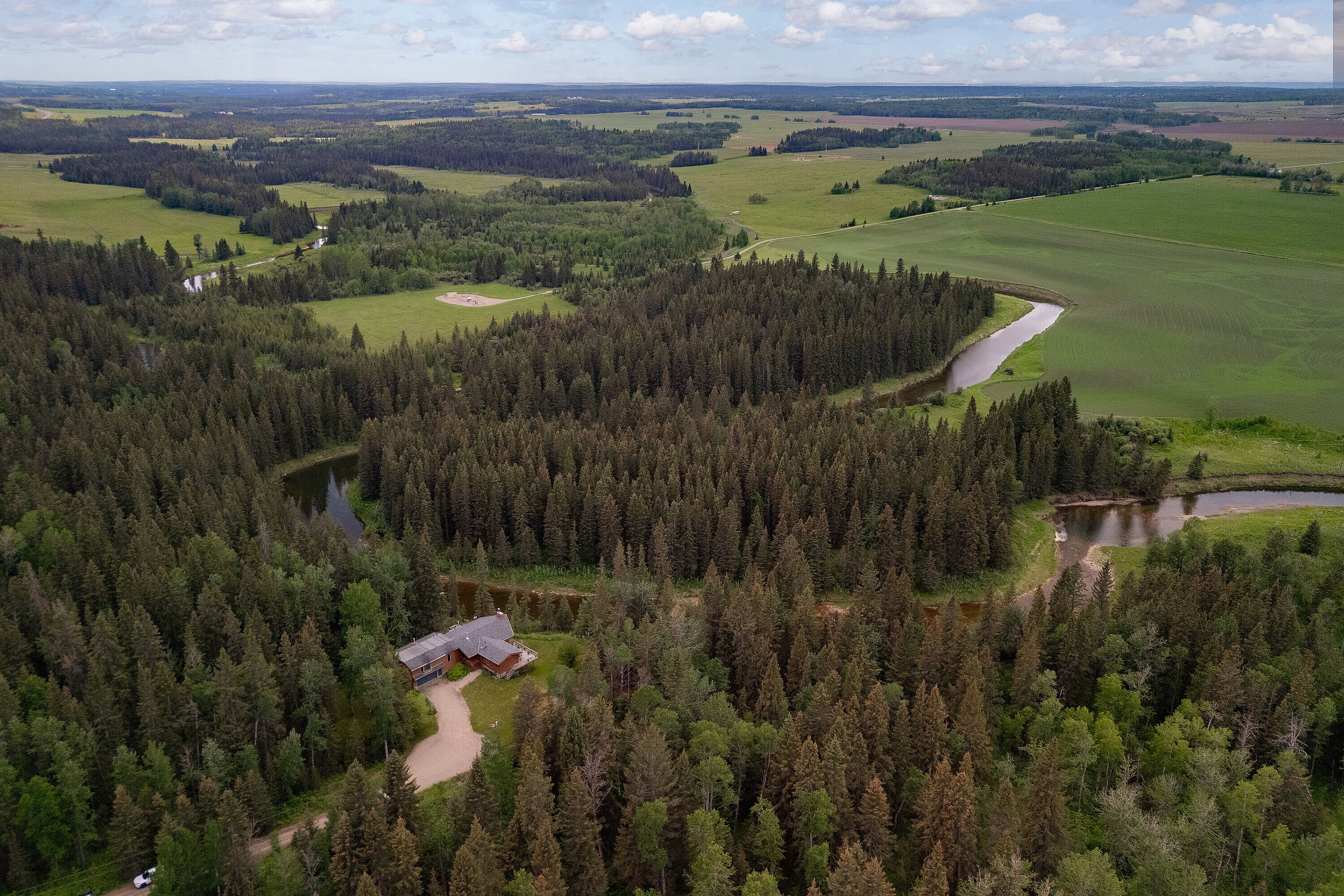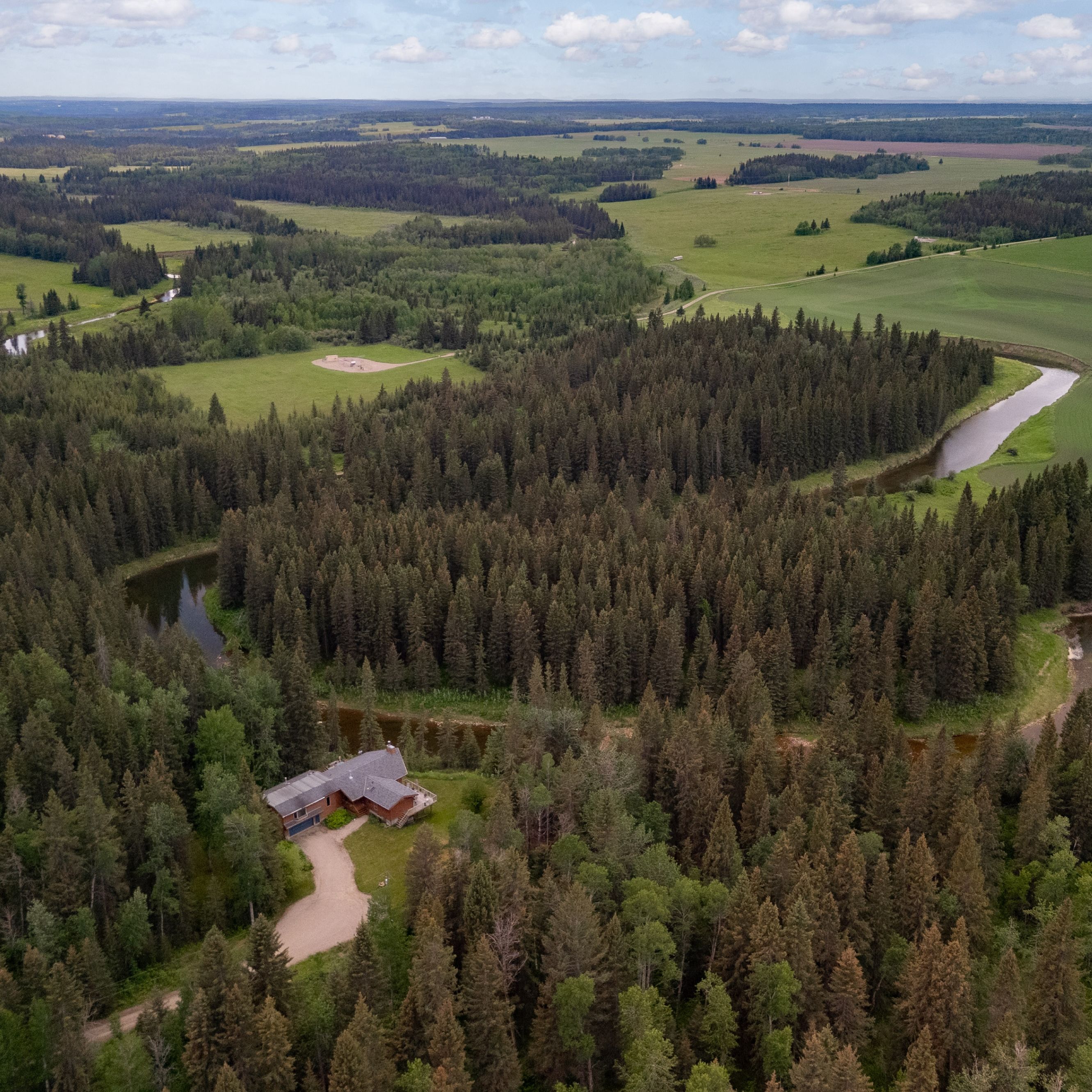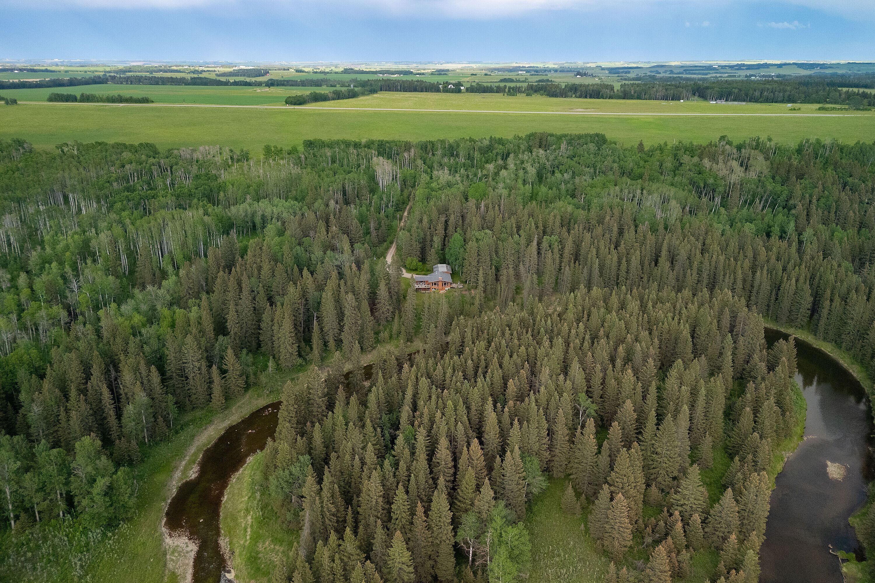 Step outside and the property opens into a world of quiet beauty and endless possibilities. Towering evergreens, sunlit clearings, and the gentle curve of the Little Red Deer River create a setting that feels miles away from everything — yet close enough for weekend escapes or full-time living.