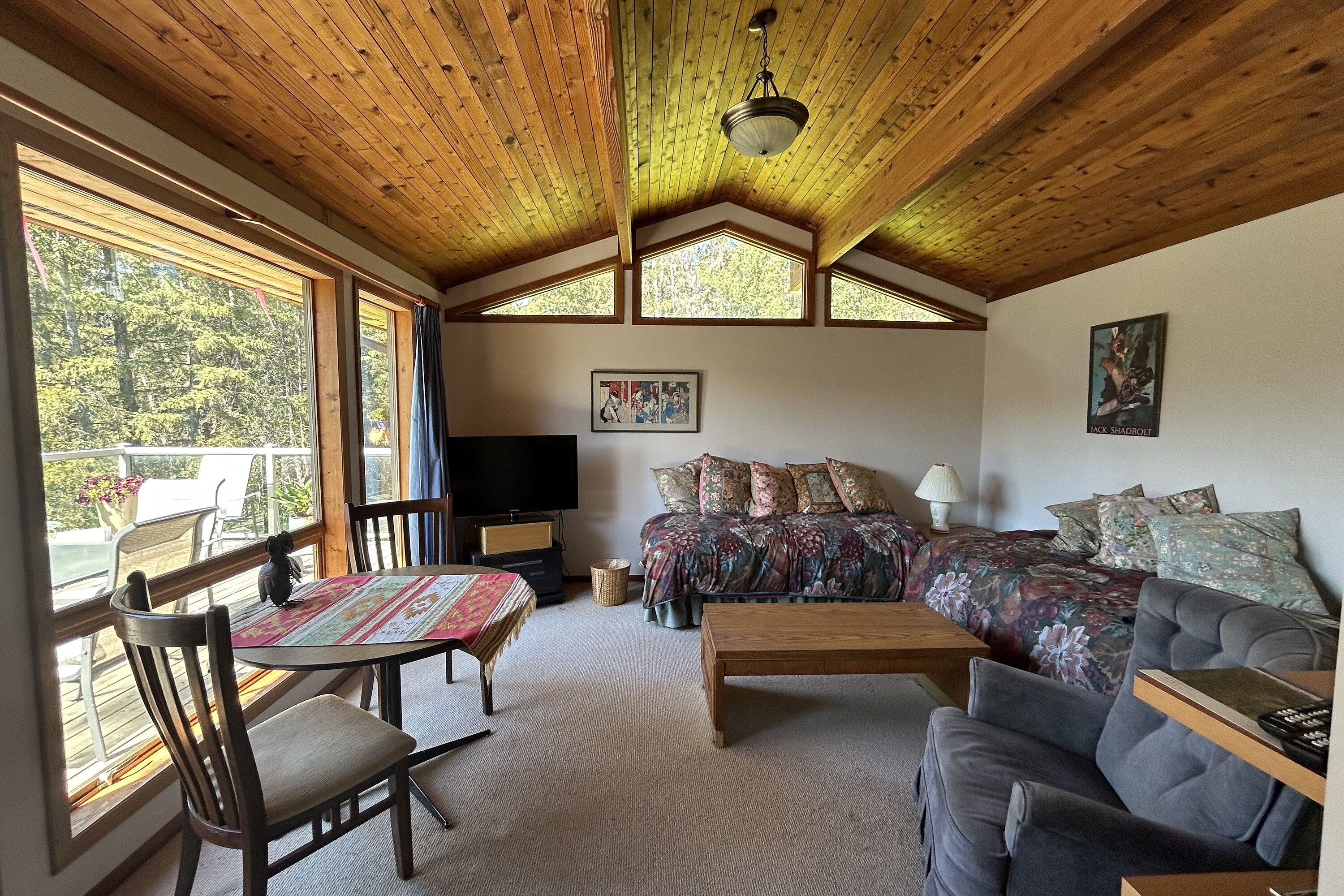 Inside, vaulted ceilings, rich wood accents, and quality craftsmanship elevate the open-concept kitchen, dining, and living areas. The main floor includes two bedrooms, a full bathroom with bathtub, a second bathroom with shower, and a conveniently located laundry room.